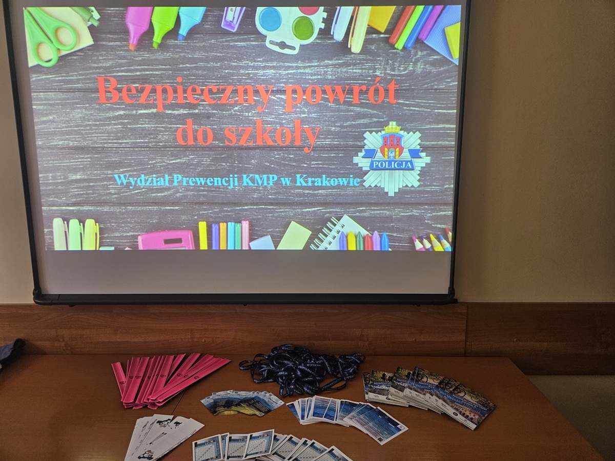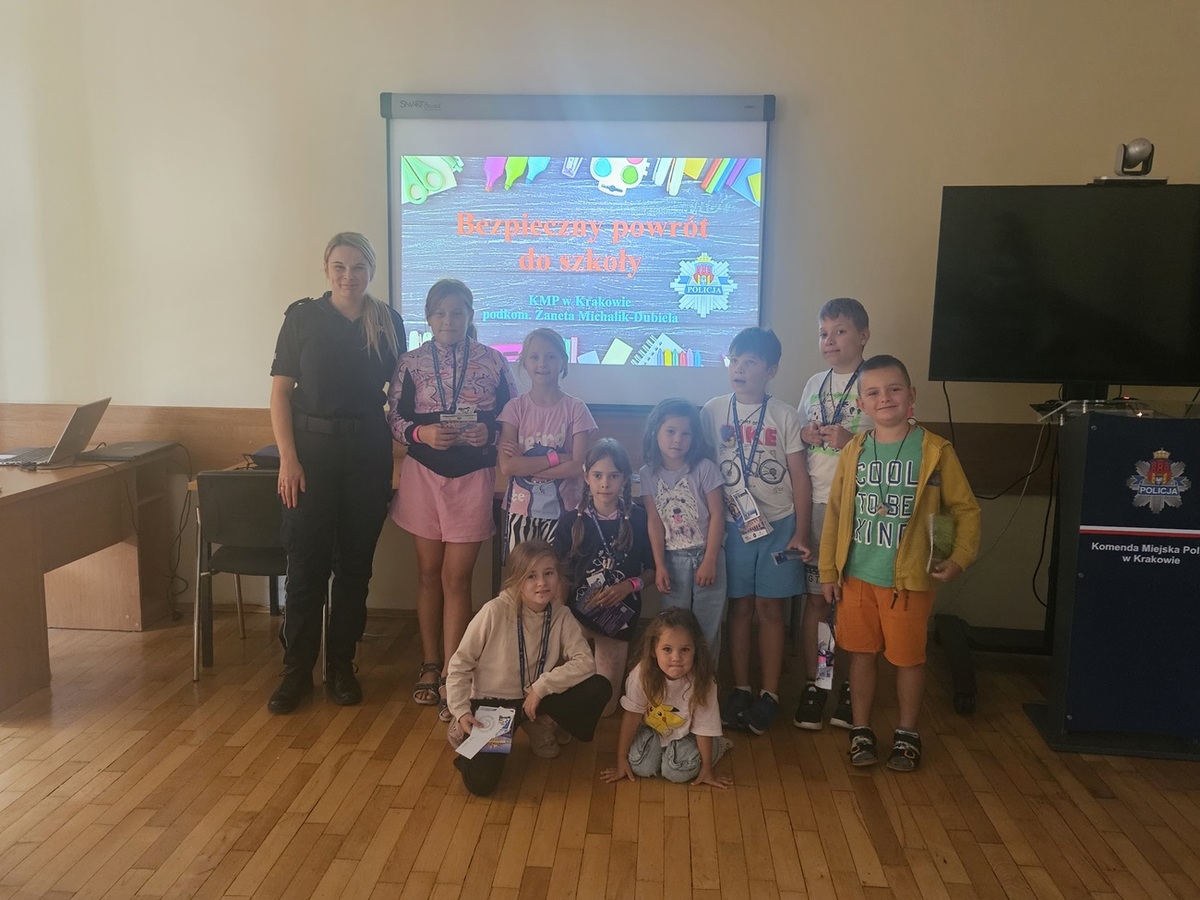 18 sierpnia br. w siedzibie Komendy Miejskiej Policji przy ul. Siemiradzkiego odbyło się spotkanie profilaktyczne dla dzieci, które uczestniczą w półkoloniach zorganizowanych przez 16 Batalion Powietrznodesantowy w Krakowie. W związku ze zbliżającym się początkiem roku szkolnego dla uczestników półkolonii policjanci przeprowadzili zajęcia edukacyjne pn. „Bezpieczny powrót do szkoły”.