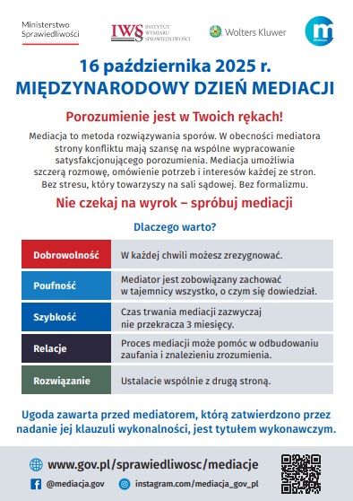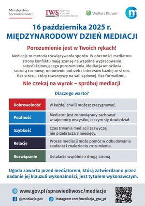 W Polsce Międzynarodowy Dzień Mediacji obchodzony jest od 2008 roku i przypada na trzeci czwartek października – w tym roku jest to 16 października. Mediacja to proces, w którym strony sporu próbują wspólnie wypracować satysfakcjonujące rozwiązanie poprzez dobrowolne i poufne rozmowy. Spotkania prowadzi mediator – osoba neutralna i bezstronna, której zadaniem jest wspieranie komunikacji, łagodzenie napięcia i stresu oraz pomaganie w osiągnięciu porozumienia.