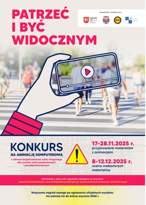 Wydział Ruchu Drogowego KWP w Krakowie wspólnie z Małopolską Wojewódzką Radą Bezpieczeństwa Ruchu Drogowego oraz Kuratorium Oświaty w Krakowie w 2025 r. realizuje Konkurs na animację z zakresu bezpieczeństwa ruchu drogowego dla uczniów szkół podstawowych i ponadpodstawowych pn. „Patrzeć i być widocznym”.