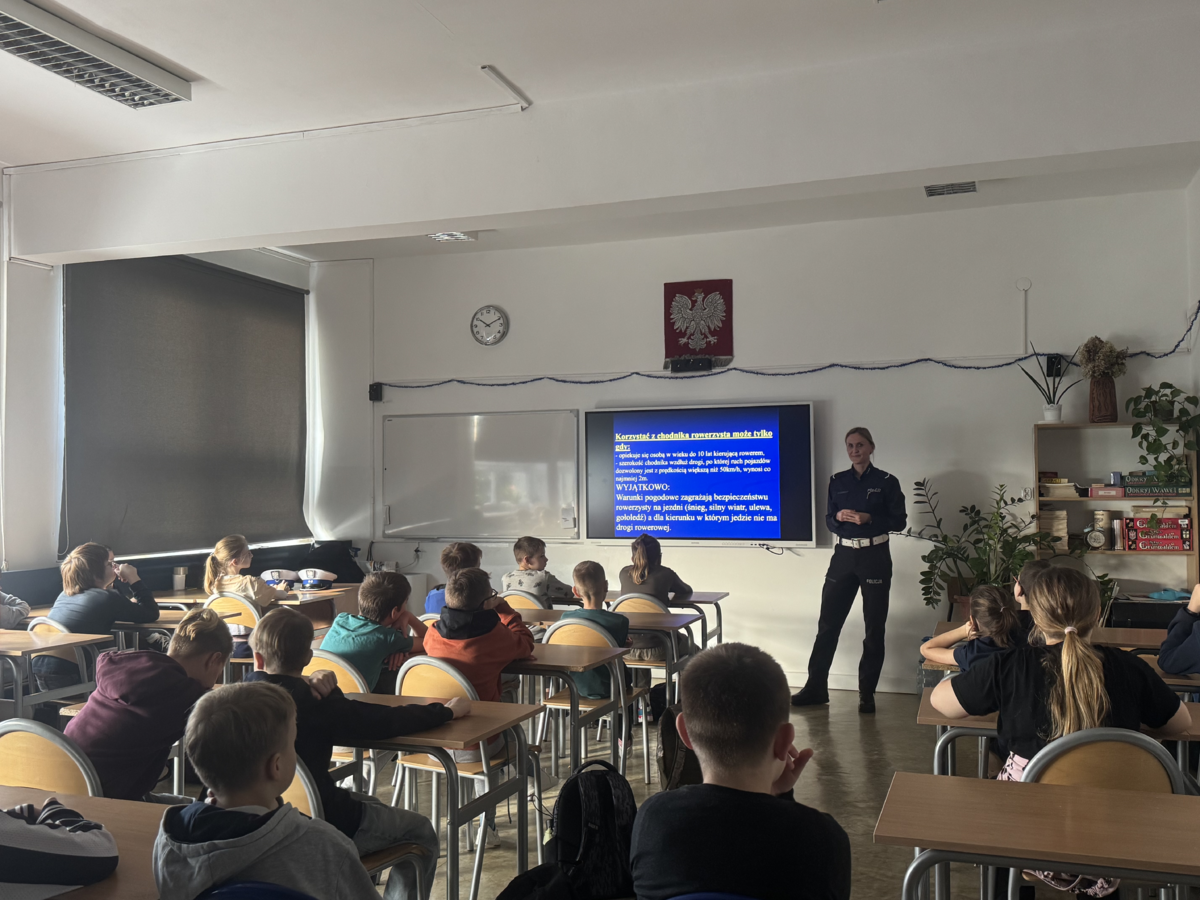 Funkcjonariusze w ramach prelekcji poruszyli wiele zagadnień dotyczących jazdy na rowerze oraz przepisów obowiązujących kierującego jednośladem. Uczniowie, dowiedzieli się w co powinien być wyposażony rower dopuszczony do ruchu, kiedy jadąc rowerem można korzystać z chodnika oraz jak wykonywać podstawowe manewry na drodze. Ponad to policjanci przypomnieli uczniom podstawowe znaki drogowe oraz zasady ich obowiązywania. Spotkanie z policjantami umożliwiło dzieciom utrwalenie wiadomości, a także uzyskanie informacji dotyczących bardziej skomplikowanych zagadnień w zakresie ruchu drogowego.