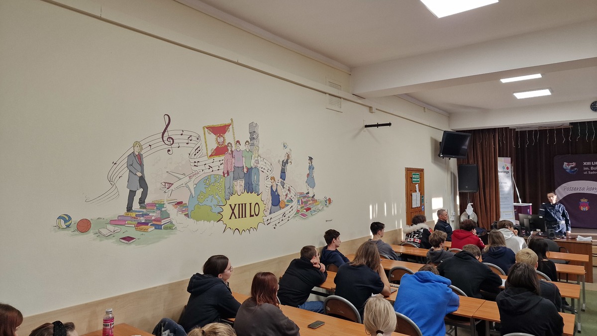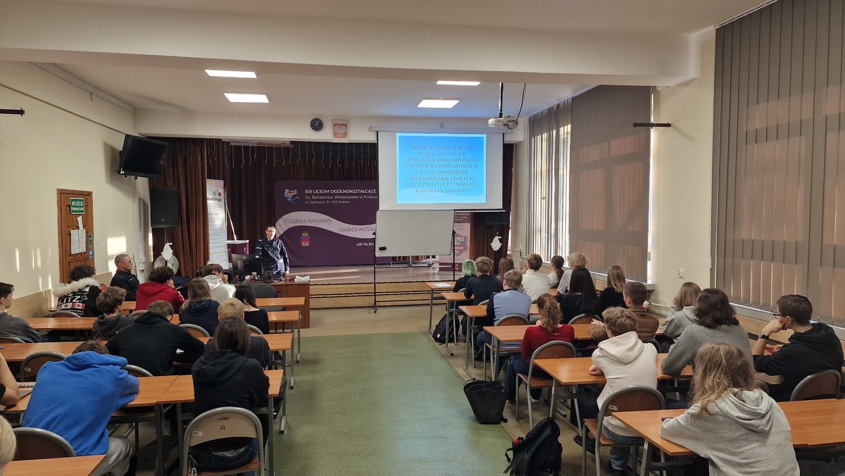 W środę w godzinach porannych, policjantki z Ogniwa ds. Prewencji Kryminalnej Nieletnich i Patologii Wydziału Prewencji Komisariatu Policji II w Krakowie, poprowadziły prelekcje z uczniami XIII Liceum Ogólnokształcącego, promując zawód policjanta. W spotkaniu uczestniczył również zastępca Naczelnika Wydziału Prewencji Komisariatu Policji II w Krakowie podinsp. Adam Rajtar. Mundurowi omówili zadania poszczególnych pionów policji oraz procedury rekrutacyjne. Policjantki przekazały słuchaczom informację odnośnie warunków finansowych dla funkcjonariuszy na początkowym etapie służby oraz jak przebiega ścieżka kariery w poszczególnych pionach formacji. Funkcjonariusze opowiadali o swoich doświadczeniach zawodowych i motywacjach, które skłoniły ich do podjęcia służby, odpowiedzieli też na szereg pytań dotyczących codziennej pracy policjantów.