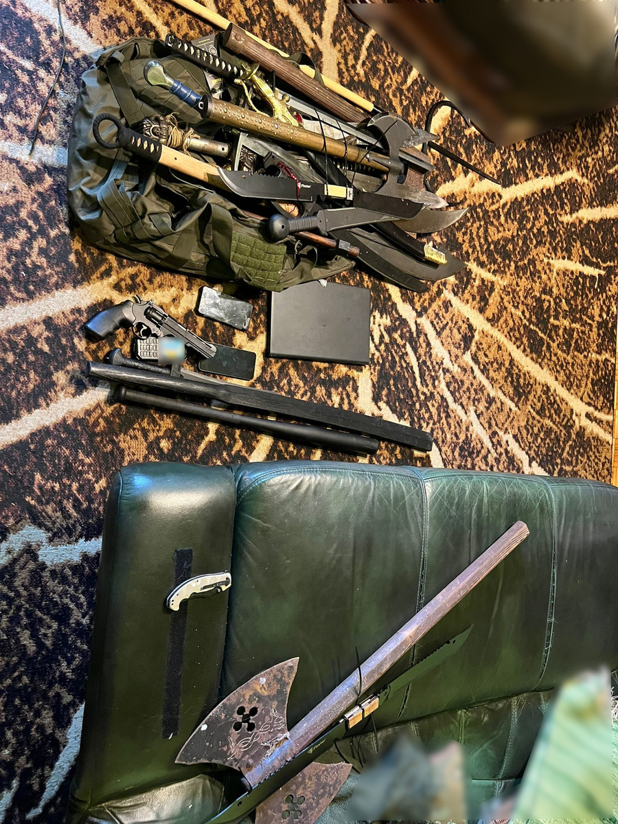 12 lutego br. około godziny 15.00 Oficer dyżurny Komendy Miejskiej Policji w Krakowie odebrał zgłoszenie dotyczące osoby, która w rejonie ulicy Cechowej miała zachowywać się irracjonalnie oraz posiadać ostre przedmioty. Na miejsce niezwłocznie skierowano policjantów z Komisariatu Policji VI w Krakowie, którzy potwierdzili, że do pracującej tam ekipy budowlanej podszedł mężczyzna, który miał grozić pracownikom, a następnie uderzył stojący nieopodal samochód. Ponieważ agresor pobiegł w kierunku pobliskiej posesji policjanci ruszyli za nim. Także w stosunku do funkcjonariuszy mężczyzna zachowywał się irracjonalnie, był agresywny, nie reagował na wydawane przez nich polecenia oraz wymachiwał w ich kierunku ostrymi przedmiotami. W związku z tym policjanci obezwładnili, a następnie wylegitymowali agresywnego mężczyznę. Następnie 38-letni mieszkaniec Kurdwanowa został zatrzymany i przewieziony do Komisariatu Policji VI w Krakowie, gdzie policjanci wykonali z jego udziałem niezbędne czynności. Ponadto w jego miejscu zamieszkania funkcjonariusze znaleźli i zabezpieczyli kilkadziesiąt niebezpiecznych narzędzi w tym m. in. miecze, noże, tasaki oraz maczety.