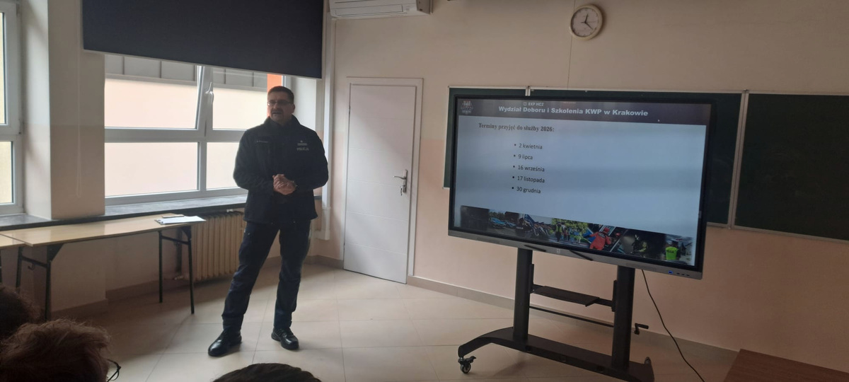 Wczoraj, w ramach promocji zawodu policjanta, Zastępca Komendanta Miejskiego Policji w Krakowie podinspektor Leszek Zagórski, przeprowadził prelekcję w IX Liceum Ogólnokształcącym w Krakowie. Komendant w przystępny sposób przedstawił etapy rekrutacji i przybliżył specyfikę policyjnej służby.