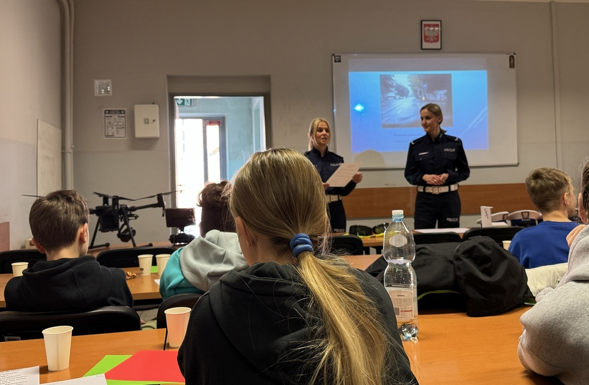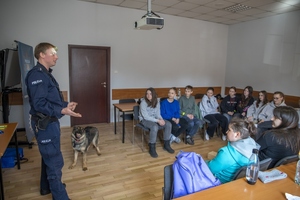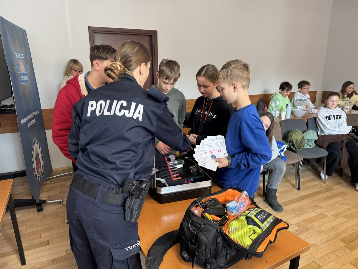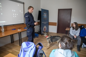 Młodzież spotkała się również z policjantami krakowskiej drogówki, którzy omówili podstawowe zasady bezpieczeństwa w ruchu drogowym. Funkcjonariusze przypominali, jak ważna jest rozwaga w poruszaniu się po drogach, zachowanie ostrożności w rejonie przejść dla pieszych oraz jakie zasady obowiązują rowerzystów i osoby poruszające się na hulajnogach elektrycznych. Druga część dnia należała do technika kryminalistyki, który zaprezentował m.in. jak zabezpieczane są ślady na miejscu zdarzenia oraz jak pobierane są odciski palców. Na zakończenie młodzież odwiedził również policyjny przewodnik psa służbowego ze swoim podopiecznym. Wizyta czworonoga, jak zawsze, spotkała się z ogromnym entuzjazmem wśród uczestników. Uczniowie chętnie obejrzeli pokaz tresury policyjnego psa oraz wysłuchali instruktażu, jak zachować się w sytuacji, kiedy atakuje nas agresywne zwierzę.