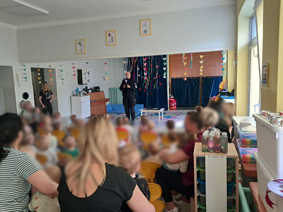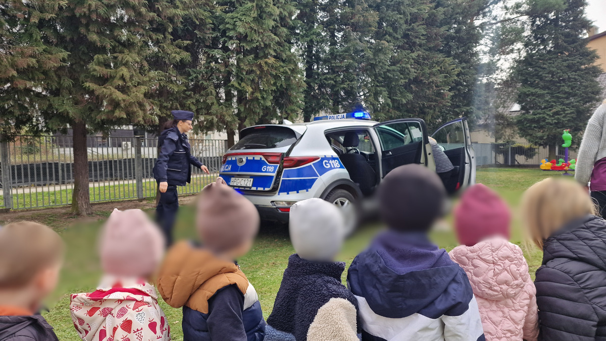 W trakcie wizyty policjantki zaprezentowały sprzęt wykorzystywany w służbie, w tym radiowóz, który wzbudził szczególne zainteresowanie uczestników. Omówiono także podstawowe zasady bezpieczeństwa, takie jak prawidłowe przechodzenie przez jezdnię oraz właściwe zachowanie w kontaktach z osobami obcymi. Dodatkową atrakcją była możliwość wykonania odcisków palców na pamiątkowych karteczkach, a na zakończenie każde dziecko otrzymało element odblaskowy zwiększający jego widoczność na drodze. W spotkaniu uczestniczyło około 60 dzieci.
