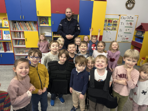 #DzielnicowyBliżejNas. Zajęcia o bezpieczeństwie, prowadzone przez policjantów Komisariatu Policji I w Przedszkolu „Pod Wawelem”